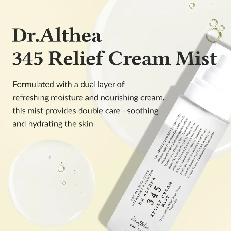 Dr. Althea 345 Relief Cream Mist combines the benefits of a moisturizing toner and a lightweight cream. Its gentle emulsion texture spreads in a fine, delicate veil, providing intense hydration, soothing the skin, and helping to reduce redness.