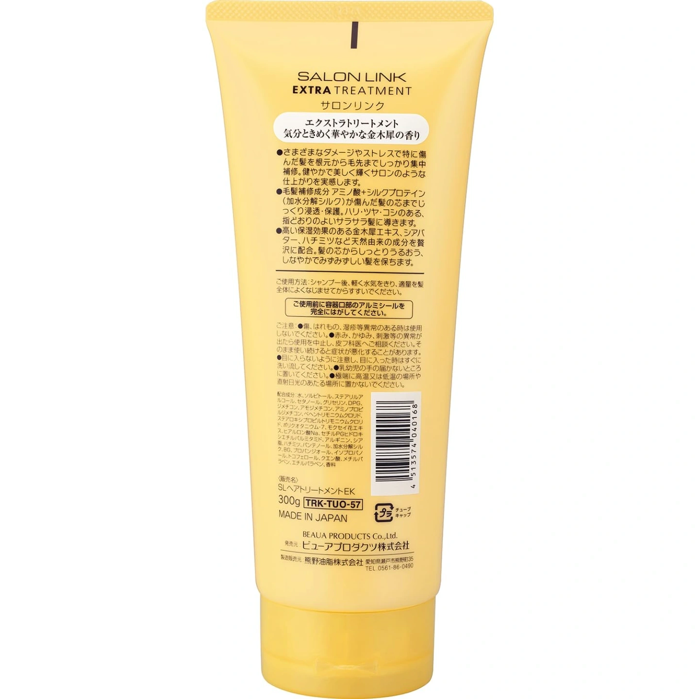 This tube is the Salon Link Extra Treatment Repair & Protect, a specialized hair mask from the Japanese brand Kumano Yushi. It is specifically formulated for hair that has been heavily damaged by heat, chemicals, or environmental stress, offering a professional-grade finish at home. The product is most notable for its "Kinmokusai" or Osmanthus fragrance, a rich, floral scent that lingers after washing.