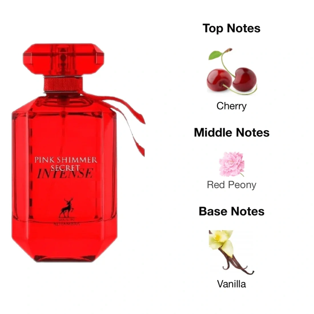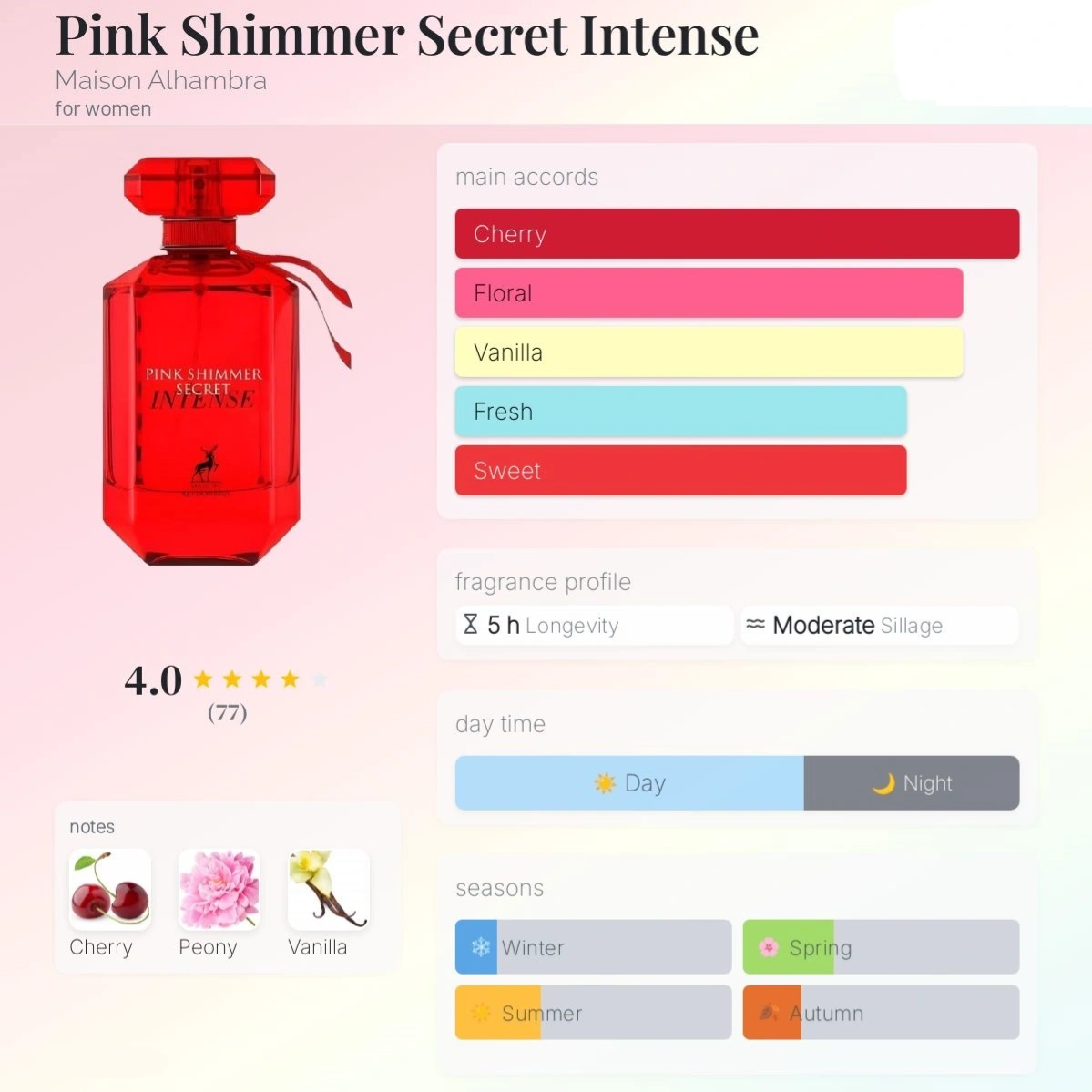 Pink Shimmer Secret Intense by Maison Alhambra is a Floral Fruity fragrance for women. Pink Shimmer Secret Intense was launched in 2022. Top note is Cherry; middle note is Red Peony; base note is Vanilla.