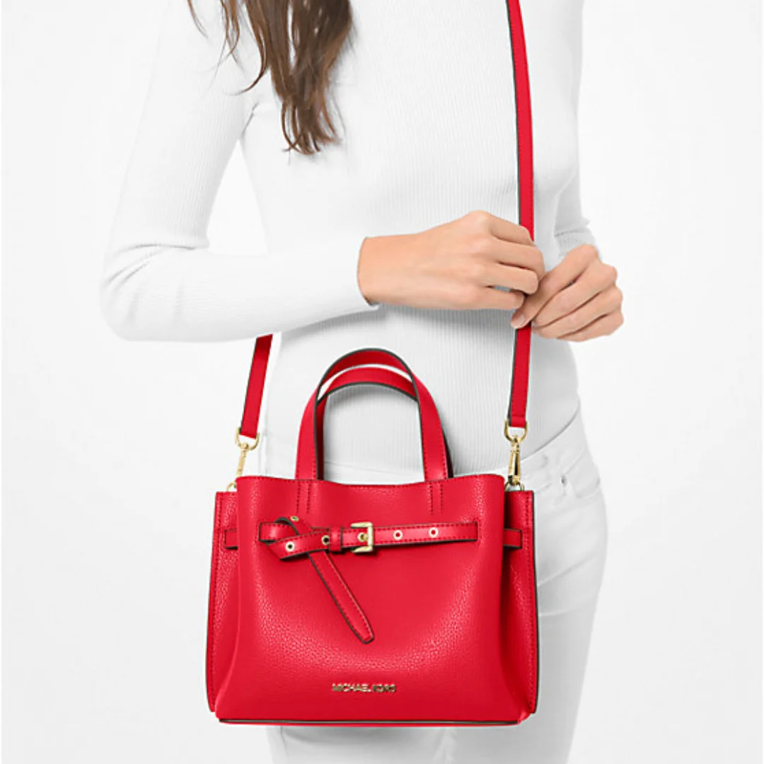 Wherever, whenever—our Emilia satchel works hard and reads chic. Elegantly streamlined and crafted from pebbled leather, this everyday handbag is designed in a sizeable silhouette punctuated by a belted silhouette and gold-tone hardware. Detach the crossbody strap to carry yours by the top handles.