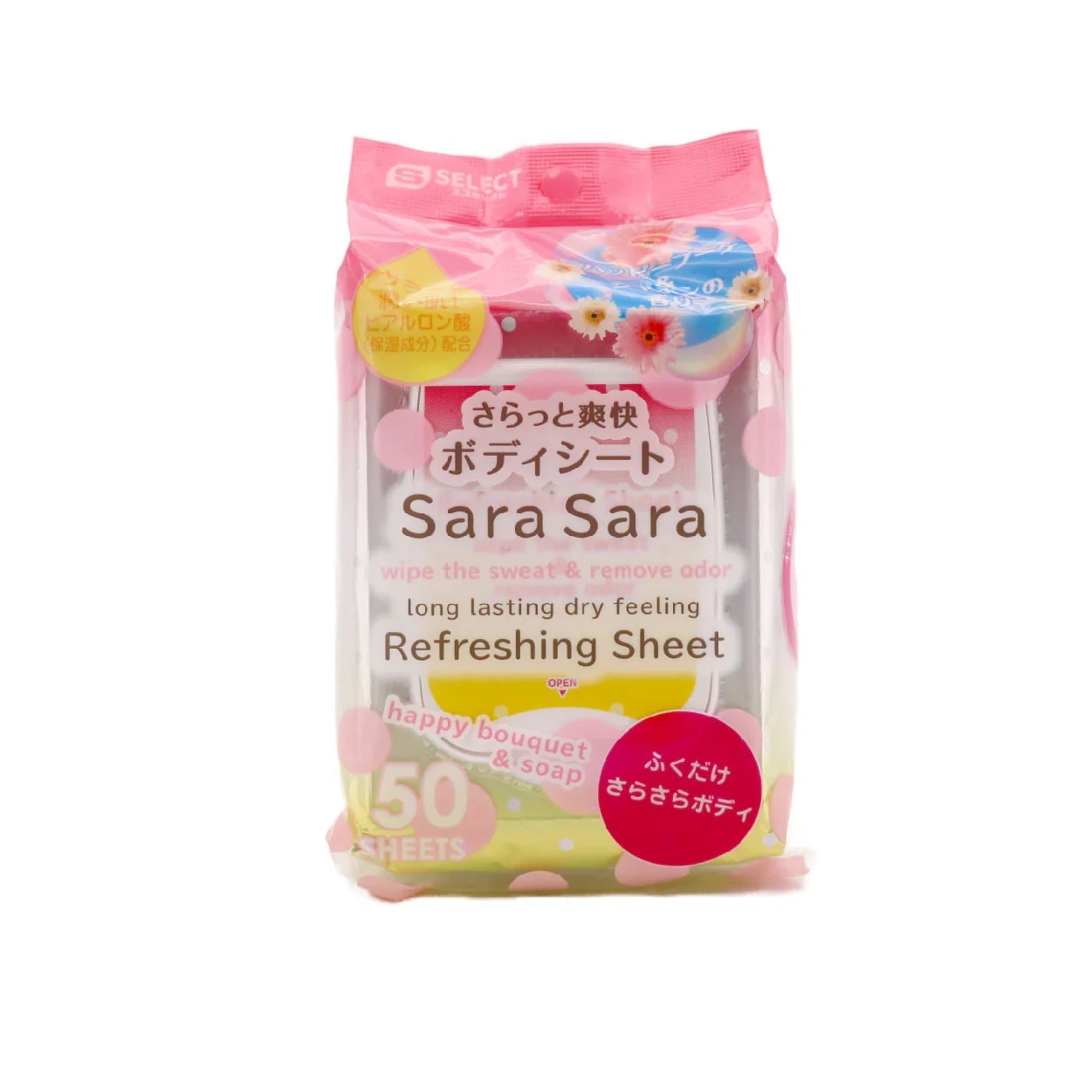 S-Select Sara Sara Smooth & Refreshing Sheets, specifically the "Happy Bouquet & Soap" scent. These are body wipes designed to remove sweat, sebum, and odor while leaving a long-lasting dry feeling. The formula is enriched with hyaluronic acid to ensure the skin remains hydrated, while integrated sweat-absorbing powders work to maintain a dry, silky texture long after use.