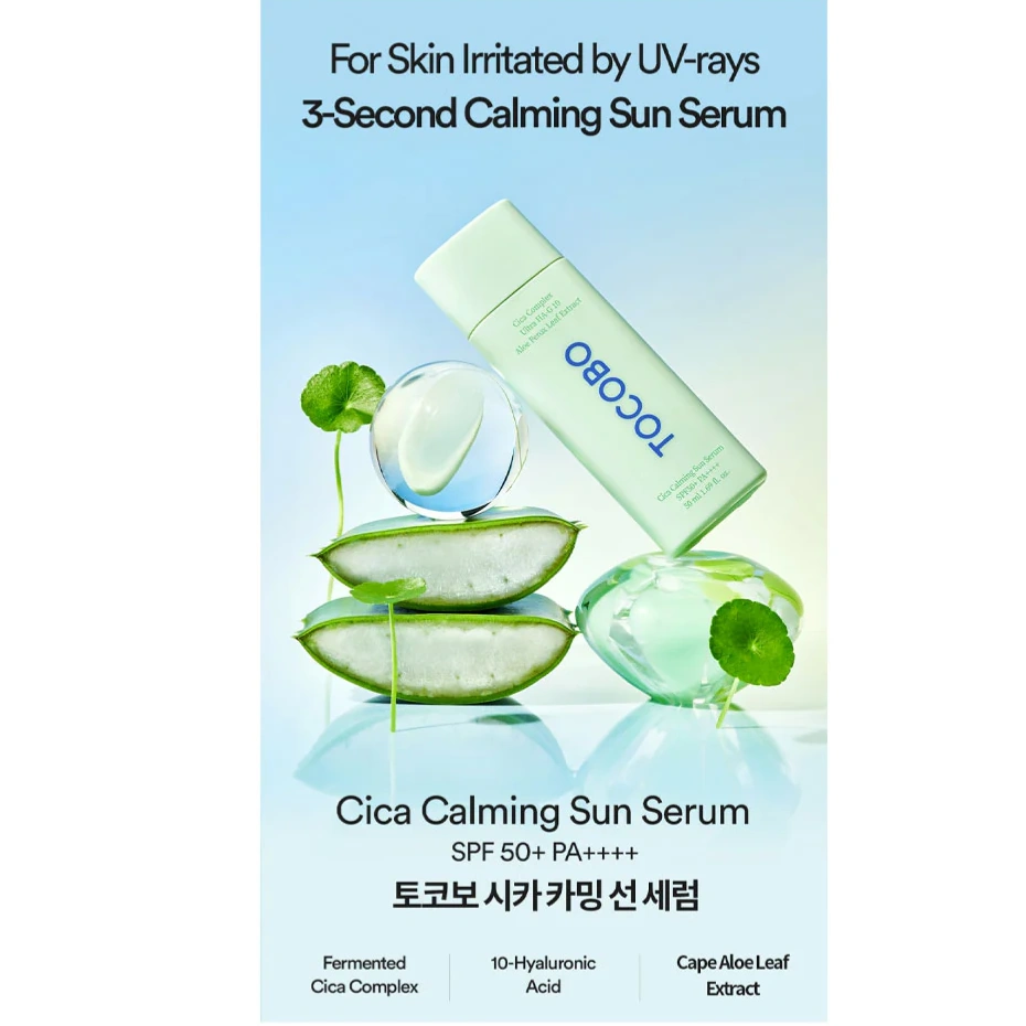 The TOCOBO Cica Calming Sun Serum SPF50+ PA++++ is a lightweight, non-comedogenic sunscreen that combines effective sun protection with soothing and hydrating properties. Formulated with fermented cica (Centella Asiatica) and a complex of ten hyaluronic acids, it delivers deep hydration and calms irritated skin. The serum absorbs quickly, leaving no white cast or greasy residue, making it suitable for sensitive and acne-prone skin.