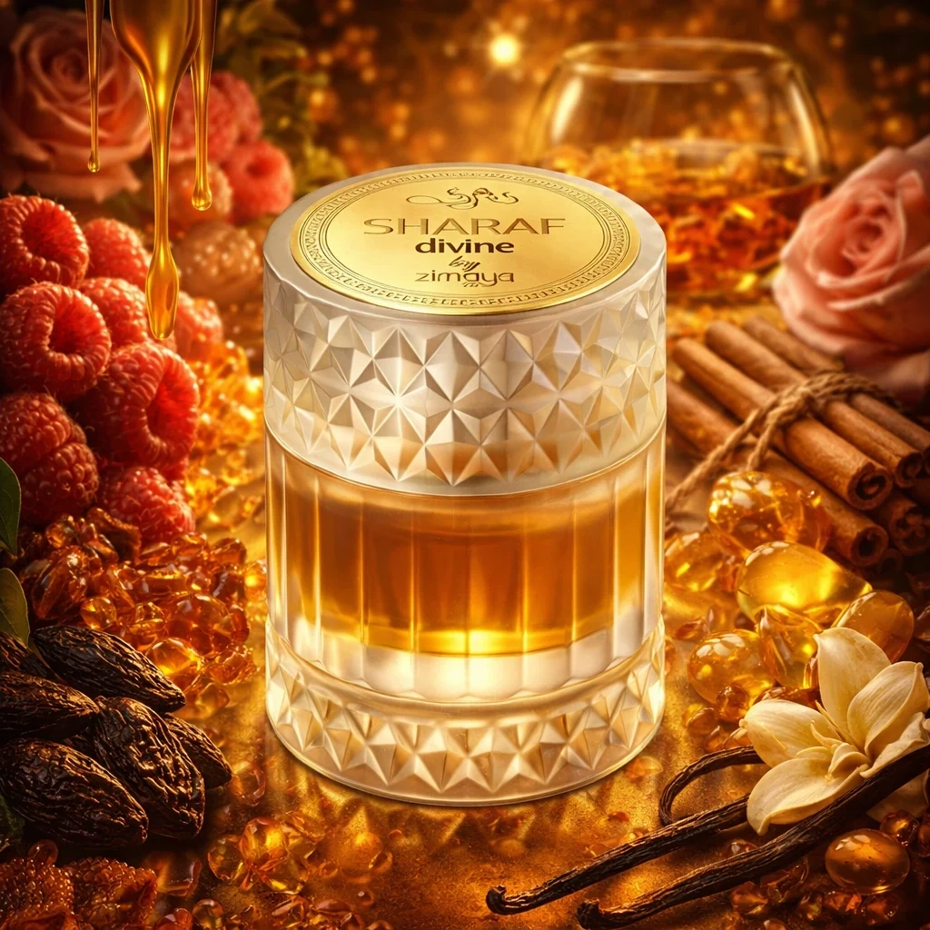 Zimaya Sharaf Divine belongs to the Amber Vanilla fragrance family, offering a warm and inviting experience from the very first spray. It opens with a fresh and spicy burst of bergamot, juicy raspberry, and a hint of cinnamon, creating a vibrant and uplifting introduction. As the scent unfolds, heart notes of crisp apple, romantic rose, and smooth caramel take center stage, adding a soft yet playful twist.